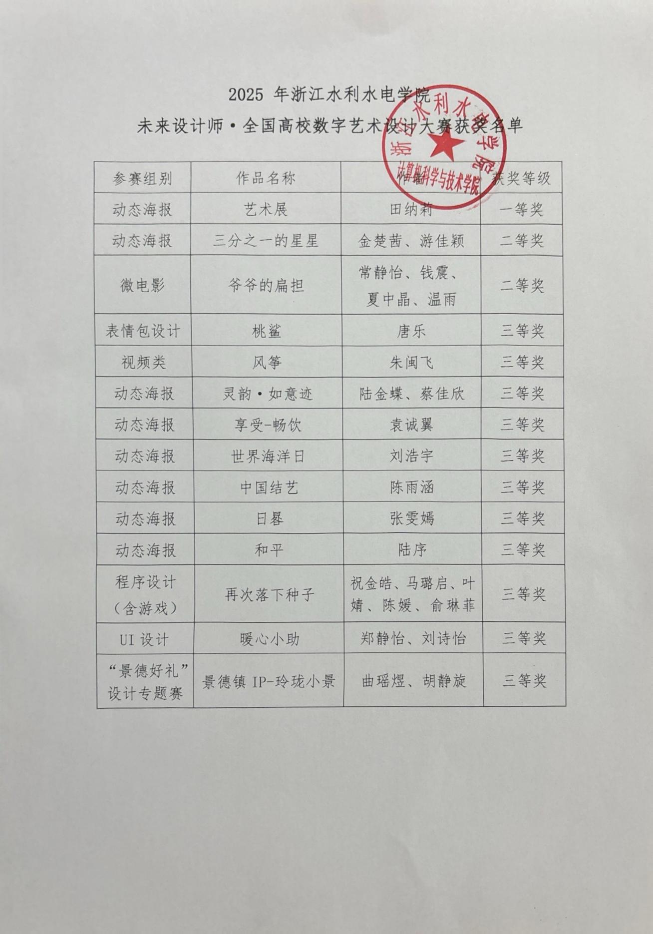 浙江水利水电学院2025年第十三届未来设计师·全国高校数字艺术设计大赛校内选拔赛按前期公布流程如期结束。对提交校赛的所有参赛作品进行评审后,根据评审结果进行评奖,获奖名单如下: