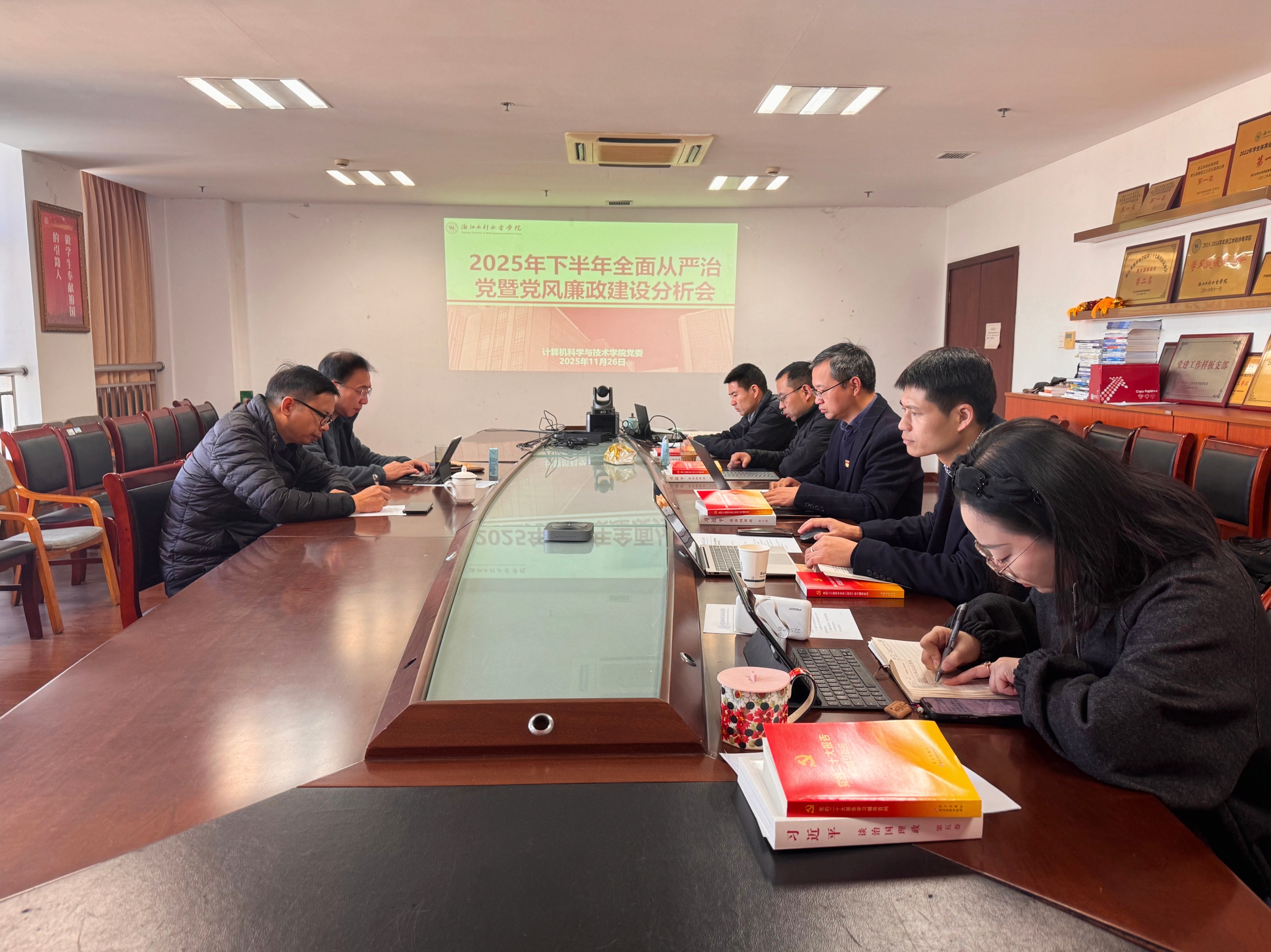 为推动全面从严治党向纵深发展,落实党风廉政建设责任制,持续推进“清廉计算机”建设,11月26日,计算机学院党委在钱塘校区教学科研综合楼808会议室召开2025年上半年全面从严治党暨党风廉政建设情况分析会,学院班子成员全体参加,学院联系校领导万健校长和校纪委委员、建工学院党委书记朱程应邀列席指导会议。